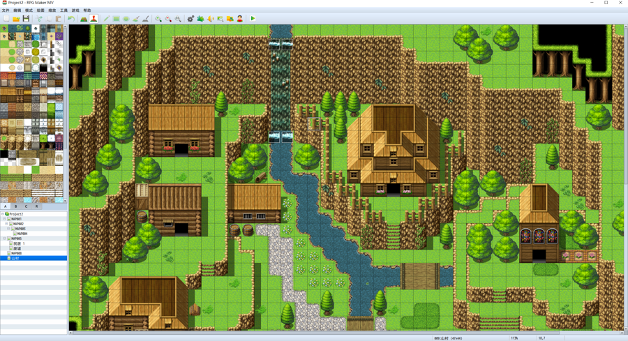 图片说明:学生基于RPG maker软件设计游戏地图中的“山村”关卡。